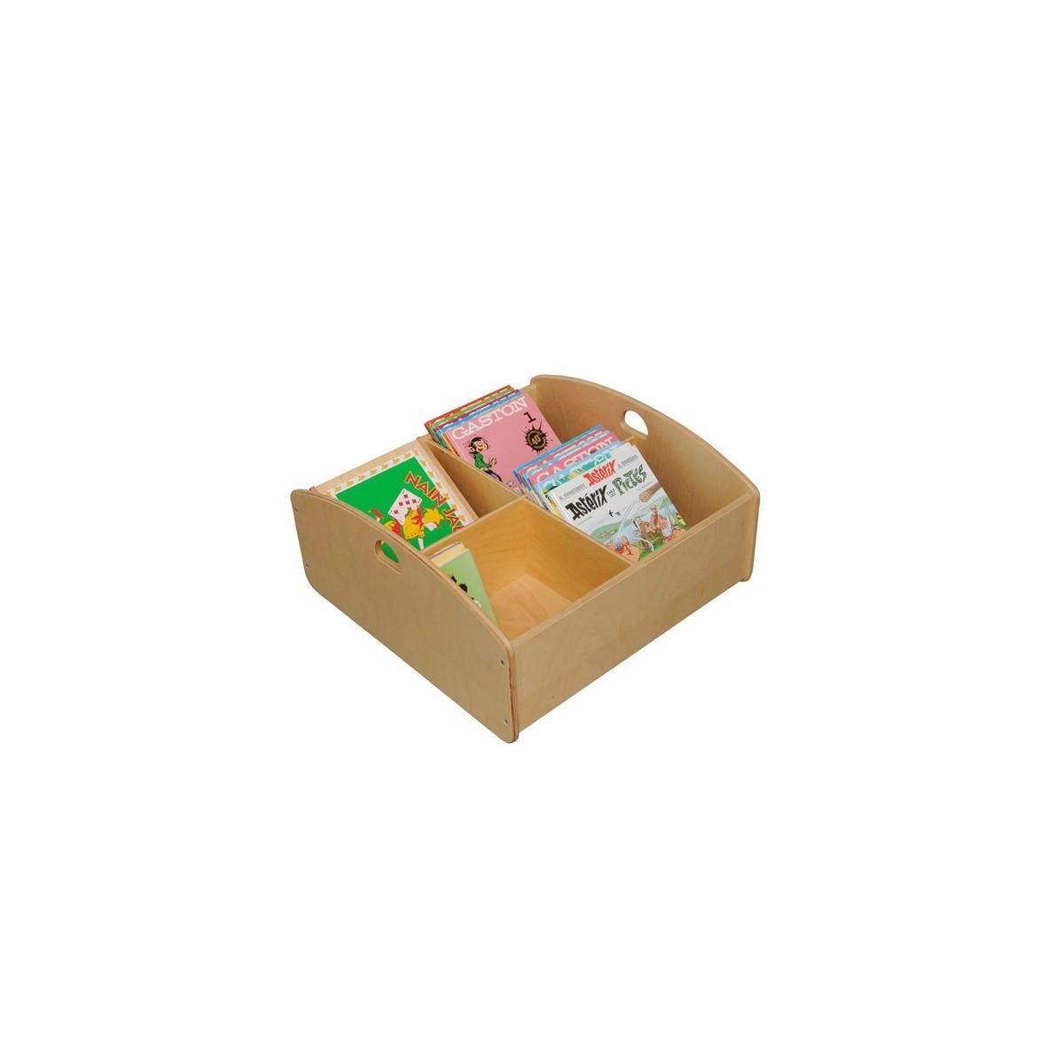 Bac de rangement sur roulettes comprenant 4 cases pour ranger les livres ou petits jouets.