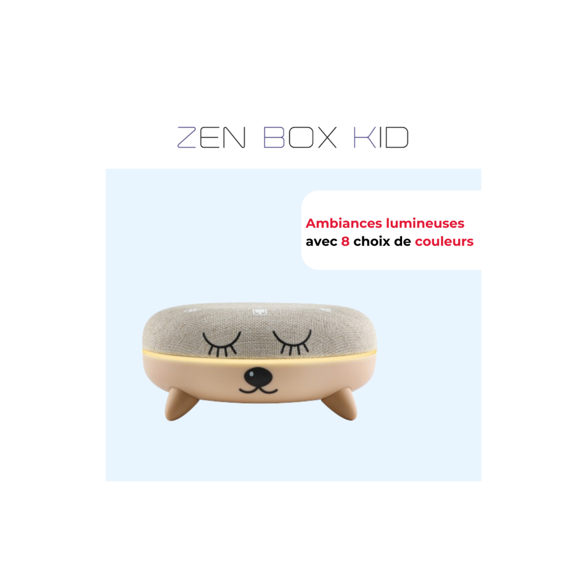 Zen Box Kid peut diffuser 8 ambiances lumineuses différentes pour créer l'atmosphère parfaite selon le moment et les préférences de votre enfant. Créez un spectacle visuel magique pour accompagner chaque son : lumière blanche, verte, bleue, rouge, bleu clair, jaune, violette, violette claire.